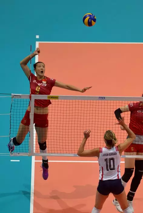 中國首盤雖被美國後上以25:22反勝,不過,中國隊在主場球迷高呼「中國加油」下反彈,先以25:13扳回一城,這盤中國單是攔網已經摘下六分。盤數1:1之後,中、美兩隊輪流發威。先是今站奪兩項個人獎的主攻朱婷、惠若琪及左手將曾春蕾重扣、虛攻不時得手,終以25:22摘下第三盤勝利;不過美國隊頑強反攻,終以25:19追成盤數2:2。