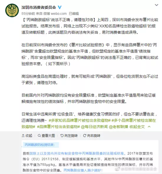 在日前深圳市消委會發佈的《薯片比較試驗報告》中,顯示有些品牌薯片中的「丙烯醯胺」含量超出歐盟規定的基準水平值,但歐盟規定的基準水平值是“績效指標”,而非“安全限量指標”。因此「丙烯醯胺超標」的說法是不正確的,已背離比較試驗報告本意。(如下圖所示)