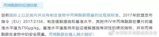 目前國內外對丙烯醯胺均沒有安全限量標準,歐盟制定基準水平值是用來驗證緩解措施有效性的績效指標,並非丙烯醯胺在食物中的安全限量。