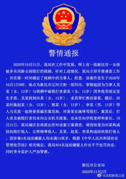 日前,網上流傳瀋陽市新民市「一女孩被多名同齡女孩毆打」視頻,瀋陽市新民市公安局官方微博2日發佈警情通報稱,事情起因為當事人吳某(女,12歲)與視頻中被毆打者姜某(女,12歲)因爭搶男朋友發生矛盾。因涉案4名違法嫌疑人均未滿14周歲,新民市公安局作出不予處罰決定,同時責令監護人嚴加管教。