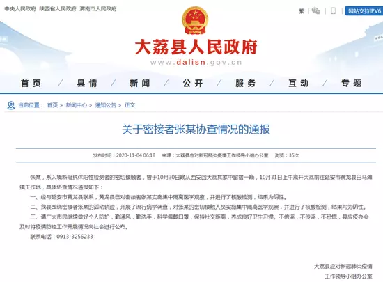 11月4日,渭南市大荔縣政府網站發佈了大荔縣應對新冠肺炎疫情工作領導小組辦公室《關於密接者張某協查情況的通報》。