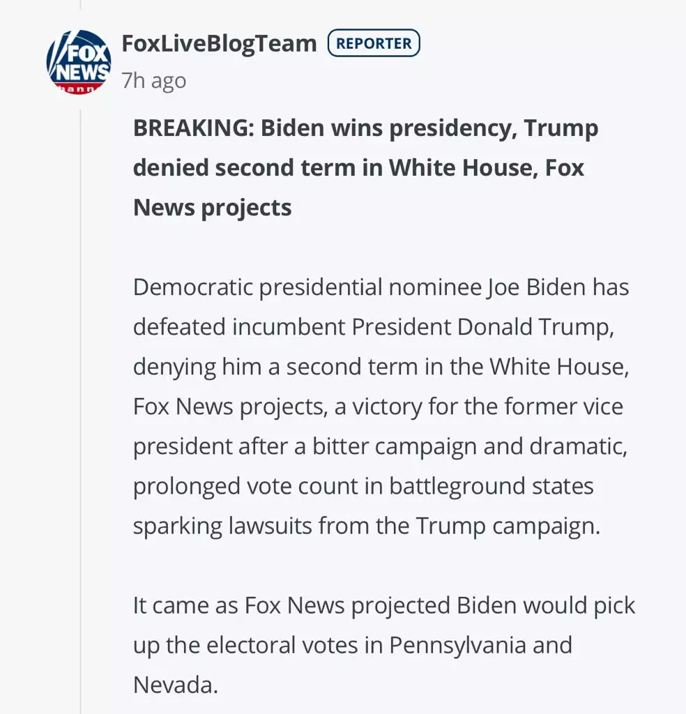 接近梅鐸的消息人士表示,大約6個月前,梅鐸就認為特朗普的任期可能即將結束。 隨後,霍士新聞對拜登的態度開始略微軟化,一位與拜登關係密切的消息人士暗示,這一決定是由高層做出的。