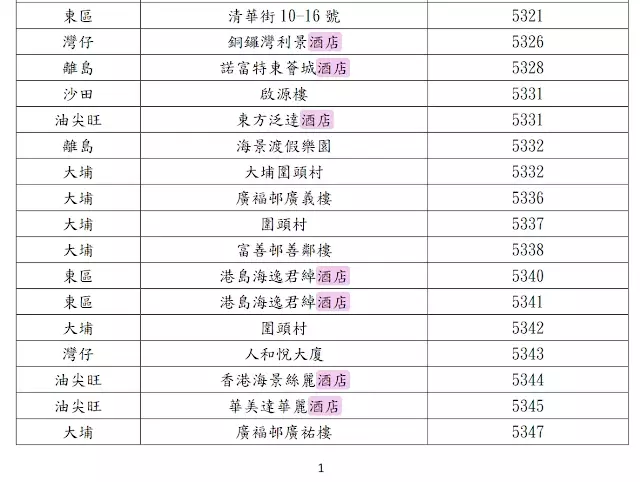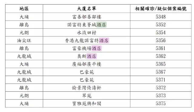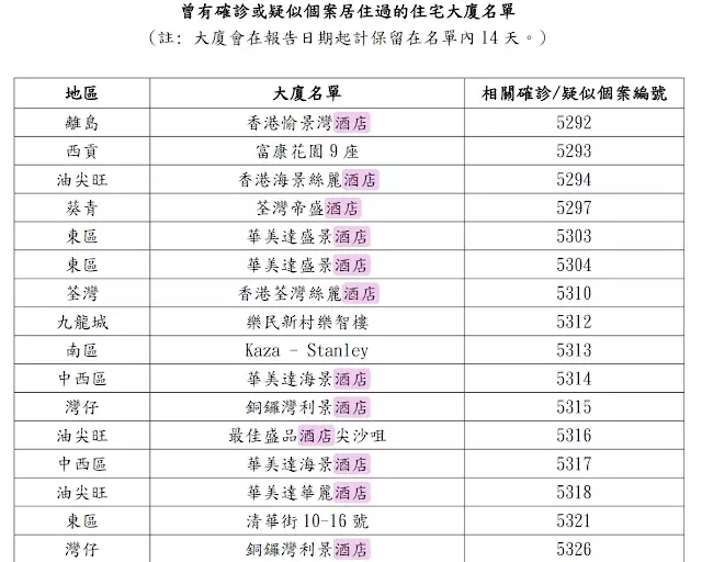 翻查衞生防護中心14天內曾有確診或疑似個案居住過的住宅大廈名單資料,43名確診者當中有22人曾入住酒店,其中1人曾入住銀礦灣「海景渡假樂園」,遍布港九新界離島各區。陳沛然醫生回顧遊輪「鑽石公主號」當時爆發疫情,指當時父母皆身在船上的藝人森美曾透露消息,疫情爆發初期,乘客都繼續在餐廳吃飯,後來感染人數多了,他們才安排在房間隔離,甚至有確診後,職員仍叫她在等候入日本醫院其間,回到房間跟丈夫一起,暗指在密閉空間會大大增加交叉感染的機會。