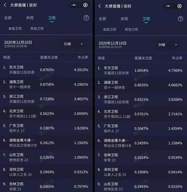 到了23:22,酷雲52城數據顯示,2020貓晚東方衛視、浙江衛視雙平台市佔率份額破13,強勢領跑全國同時段節目。