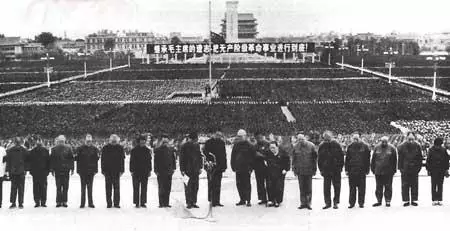 毛澤東追悼大會台上所有領導人合影:「四人幫」也忝列其中。