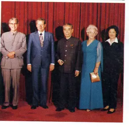 1975年喬冠華(左一)章含之(右一)陪同周總理在醫院會見外賓。
