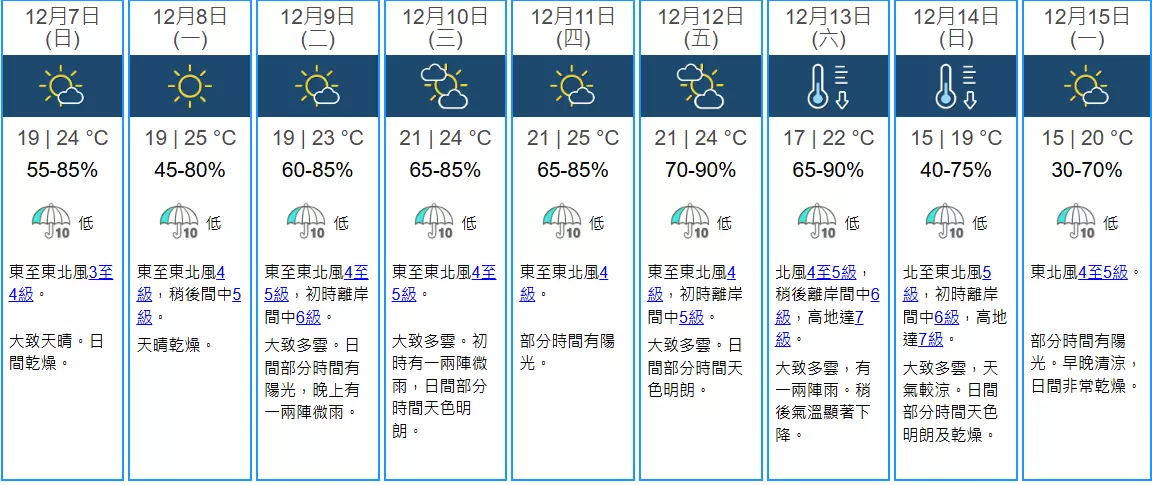 本港地區星期日(12月7日)天氣預測,大致天晴。日間乾燥,最高氣溫約24度。吹和緩東至東北風。