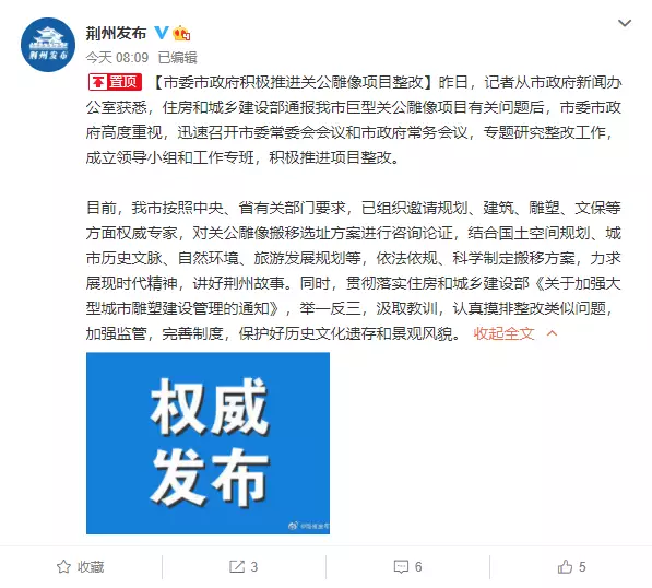 按照荊州市政府新聞辦的說法,當地已組織邀請規劃、建築、雕塑、文保等方面權威專家,對關公雕像搬移選址方案進行諮詢論證,依法依規、科學制定搬移方案。同時,舉一反三,汲取教訓。
