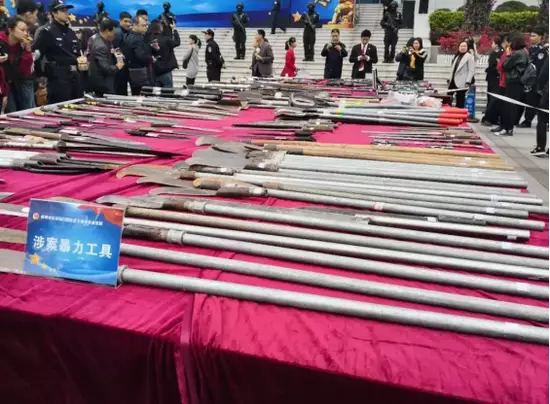 梧州公安向公眾展示專項鬥爭中收繳的涉案暴力工具。