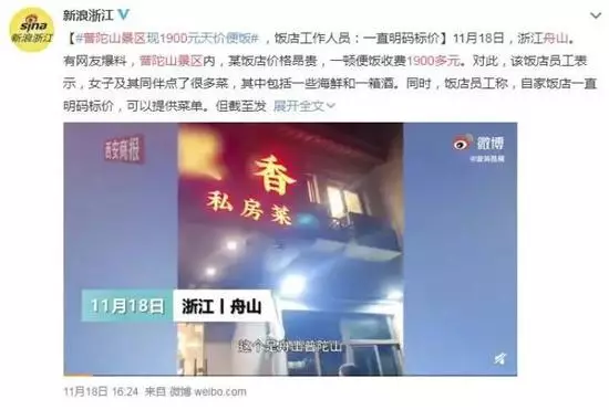 11月18日,有網友爆料舟山普陀山景區1900多元一頓的天價便飯上了熱搜,引發關注。