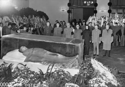1976年9月,華國鋒、王洪文、葉劍英、張春橋、江青、姚文元、李先念在毛澤東追悼會上