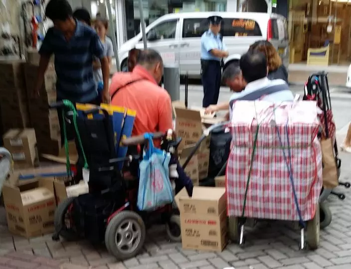 《星島日報》記者日前在上水石湖墟,發現多名乘坐電動輪椅的水貨客先後到場,眾人在派貨者協助下,將大批日用品和食品等「雜貨」,塞滿放於輪椅靠背後的帆布袋,再全速「驅椅」前往上水站乘港鐵往落馬洲。