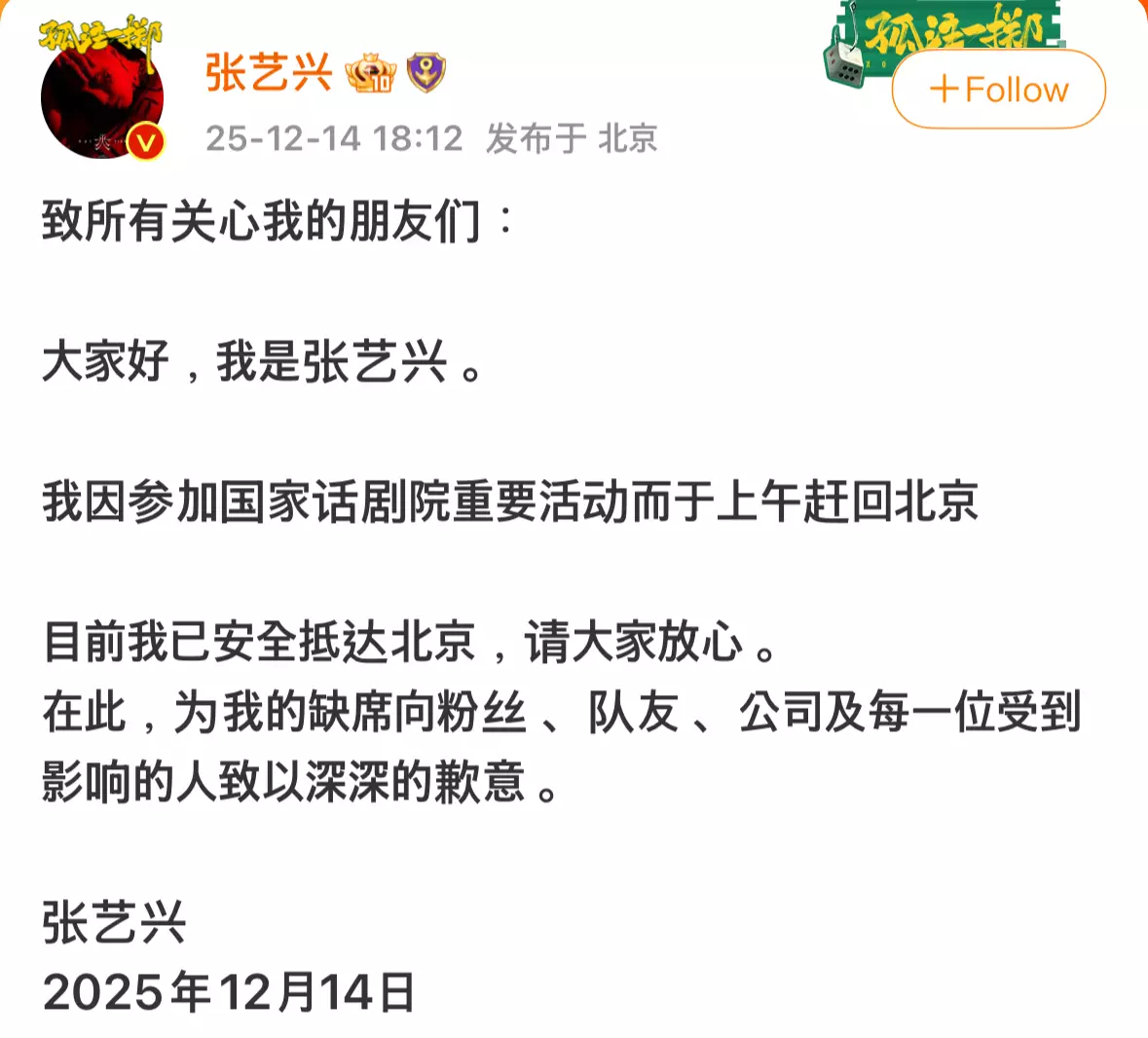 當日晚上,張藝興本人在微博親自發文解釋:「因需要參加國家話劇院的重要活動,所以在上午趕回了北京,目前我已安全抵達北京,請大家放心。在此,為我的缺席向粉絲、隊友、公司及每一位受到影響的人致以深深的歉意。」他的粉絲多數表示理解與支持,留言「歡迎回家」、「你沒有對不起任何人」;但也有部分網友批評「活動當天才知道?」、「太沒有責任感」,甚至質疑臨時缺席是否對已抵達現場的粉絲不尊重。