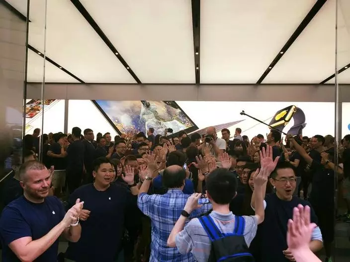 今早九時正,大批Apple Store店員列隊迎接,並與入場人士擊掌歡呼。不少「果粉」入場「朝聖」並得到紀念T裇都表示興奮,更有人即場換上與店員合影,也有不少人在大蘋果標記前拍照留念。