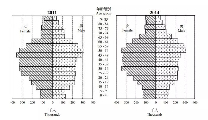 報告又特別提到,香港的人口結構持續趨向非年輕化及老化,年齡介乎45-64歲的人士,在人口中的比例明顯增加,從2001年的22%上升至2014年的31.8%,而15歲以下的人口數目及比例則有顯著下降。