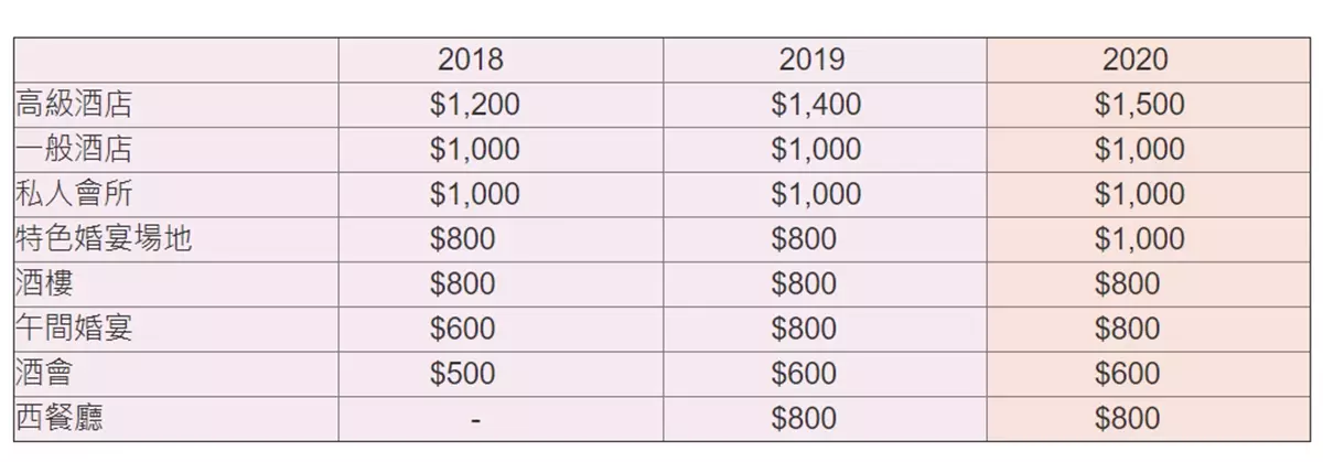 生活易 (ESDlife) 於今年8月至9月期間訪問逾1000位在2020至2022年間結婚的新人,了解他們的結婚開支。結果發現現時新人的結婚開支稍微下跌,但「人情」價格則不跌反升。調查顯示,高級酒店的「人情」連續2年上升,由1,400元升至1,500元,為各場地最高。而特色婚宴場地的「人情」中位數則由港幣800元上漲至1,000 元,升幅達25%,與一般酒店及私人會所一樣。