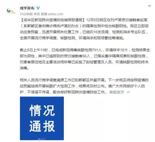 12月8日,成華區在對盧某密切接觸者趙某(系郫都區首例確診病例盧某的孫女)的隔離檢測中檢出核酸陽性。成華區立即啟動應急預案,迅速開展相關處置工作,已組織16支流調、檢測和消殺專業隊伍,全面開展流行病學調查、核酸檢測、環境消殺和現場管控等措施。