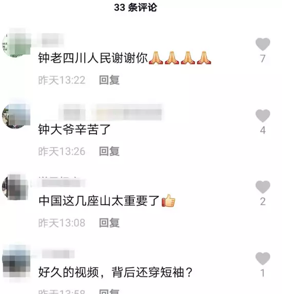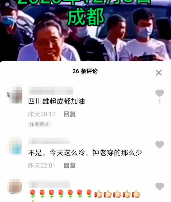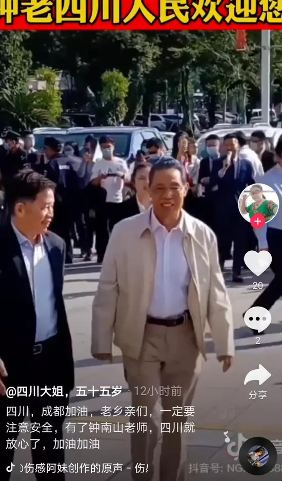 視頻引發了網友的關注,截至今晨10點,其中一則視頻被點贊2000多次。不少網友信以為真,為鍾南山豎起大拇指,「四川人民感謝鍾老」「鍾老辛苦了」「鍾大爺辛苦了」;也有網友擔心,也有人開始為四川成都喊「加油」。
