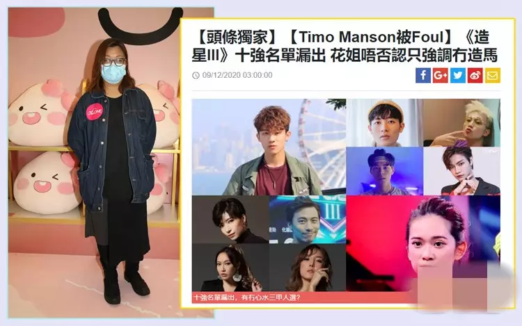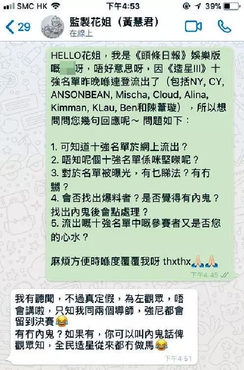 日前網上討論區流出《全民造星III》十強名單,節目監製花姐(黃慧君)今日和MIRROR成員姜濤出席活動時拒絕評論名單真偽,又自爆連餐廳老闆也恍如「親歷其境」,講述二十強入十強的過程:「首先我唔記得十強名單有誰,只知道有不同人士在不同群組討論,其實傳聞有真有假,我也想講給大家聽,但要保留少少神秘感,最希望大家知道節目很真實,沒有造馬。」