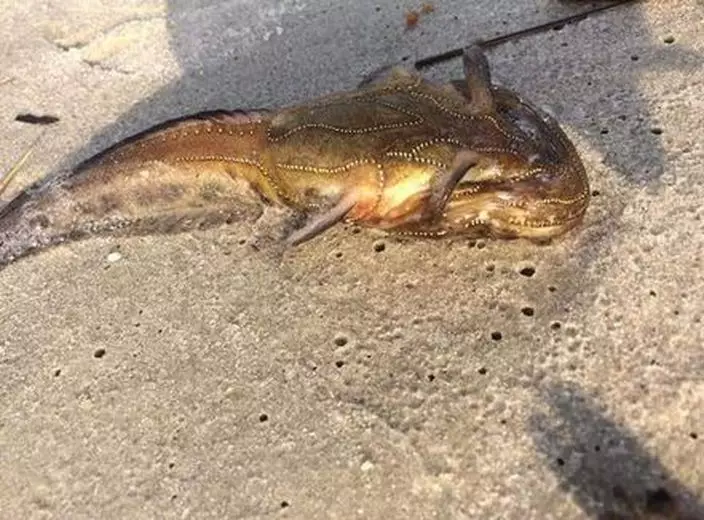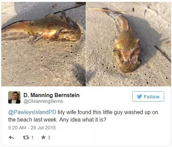 伯恩斯坦(D. Manning Bernstein)的太太上周一在帕利斯島沙灘散步時發現一條怪魚。照片所見,怪魚全身呈金色,身上有粒狀物組成有規律的線條斑紋。他大感不惑向漁民和當地警方求教,想知道怪魚到底何方神聖,可惜警方也不知道,要向網民求助。