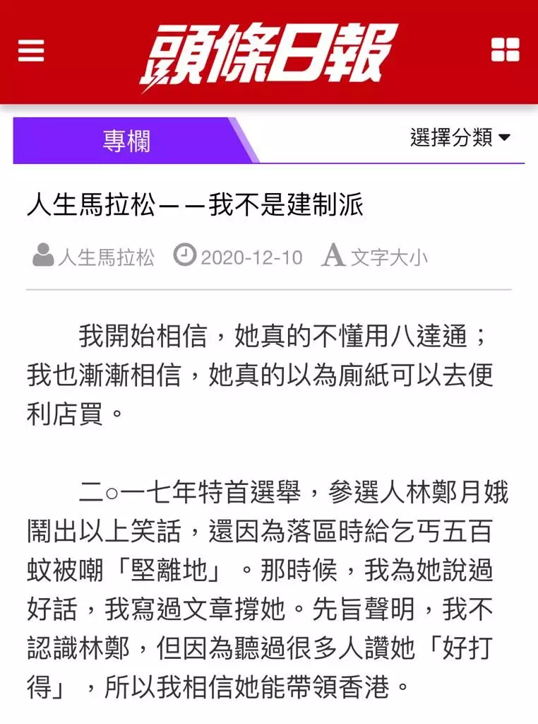 事緣《頭條日報》昨日刊登屈穎妍專欄文章,標題寫住「我不是建制派」,屈穎妍喺文中話,林太喺2017年特首選舉,鬧出不識用八達通等笑話,但她當時依然相信林太可以帶領香港,所以寫文章撐林太,「三年下來,我證實自己錯了」。