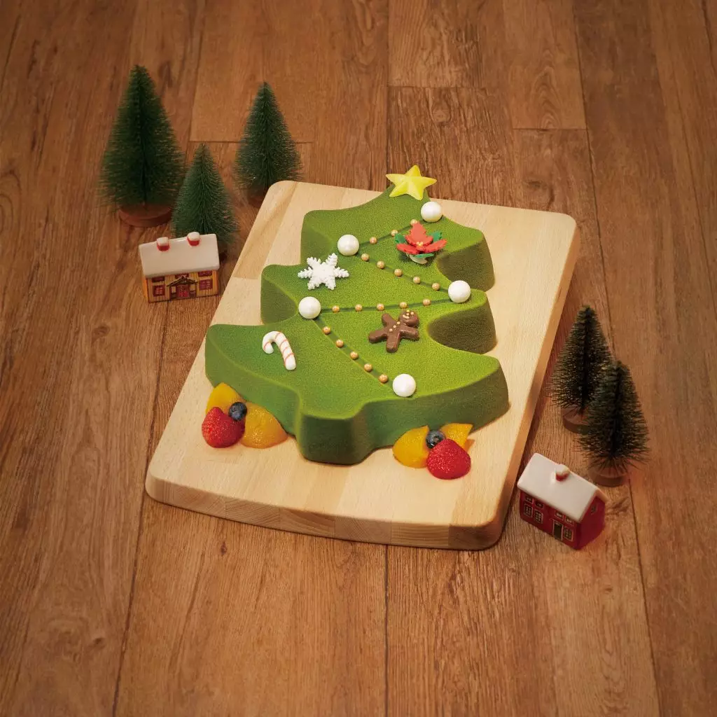 綠油油的立體聖誕樹造型包裹著黑車厘子啫喱的比利時朱古力慕絲,「睇得又食得」!慕絲下層層朱古力蛋糕和牛油忌廉完美交錯,重重味覺驚喜,為節日帶來歡樂氣氛!