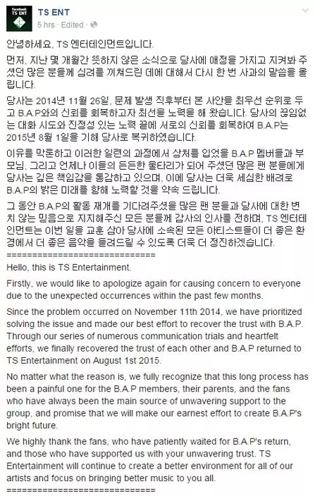 TS娛樂今天在Facebook發表官方聲明,指雙方已達成和解,B.A.P已經已於8月1日正式回到公司,B.A.P亦將會在近日回歸舞台,不會再出現無故退團的事情,盼各位能夠期待他們的新專輯。