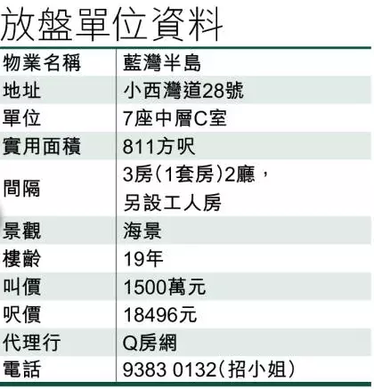 小西灣藍灣半島樓齡約18年,基設設有住客會所及購物商場,而且多條巴士路綫在此設站,通勤度高。以下介紹屋苑的放盤,實用面積811方呎,屬屋苑最大面積的分層戶型,3房套連工人房設計,前臨永久海景。睇樓王