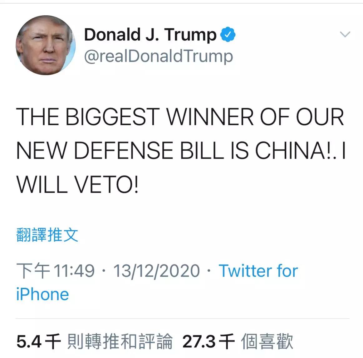 12月13日,特朗普更是在推特上宣稱:「我將否決,中國才是我們新國防法案的最大贏家!」這條推特中,所有字母都是大寫。