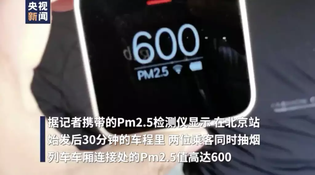 △K215次列車上在吸煙的乘客在北京站始發後30分鐘的車程里,車廂連接處先後有八位乘客前來吸煙。據PM2.5檢測儀顯示,兩位乘客同時抽煙時,列車車廂連接處的PM2.5值高達600。