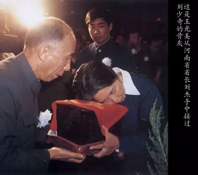 在開追悼大會前,要將劉少奇同志的骨灰從河南迎回北京。為此,胡耀邦主持中央書記處會議專門研究並批准了中央組織部報送的《關於劉少奇同志骨灰從鄭州迎回北京的請示報告》,知會治喪委員會辦公室辦理。治喪委員會決定由王首道、劉瀾濤等人陪同王光美及子女前往鄭州迎回骨灰。