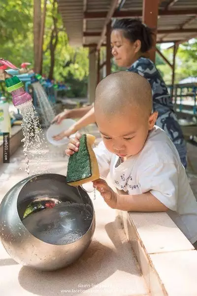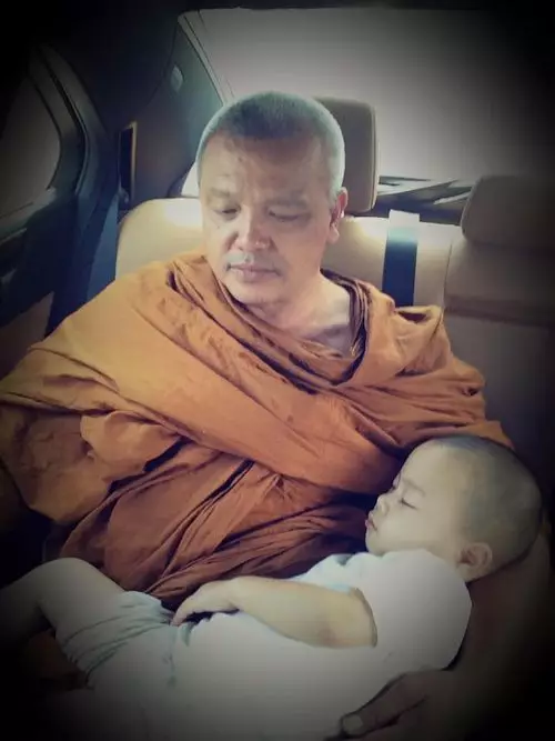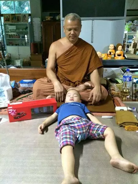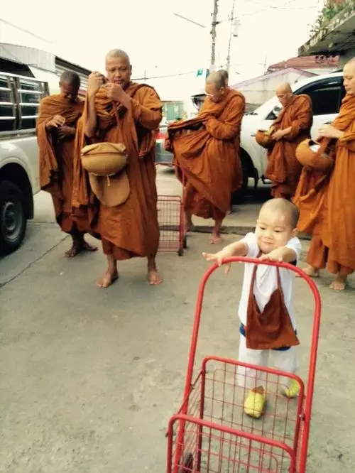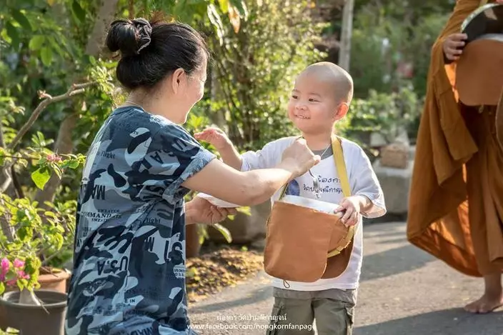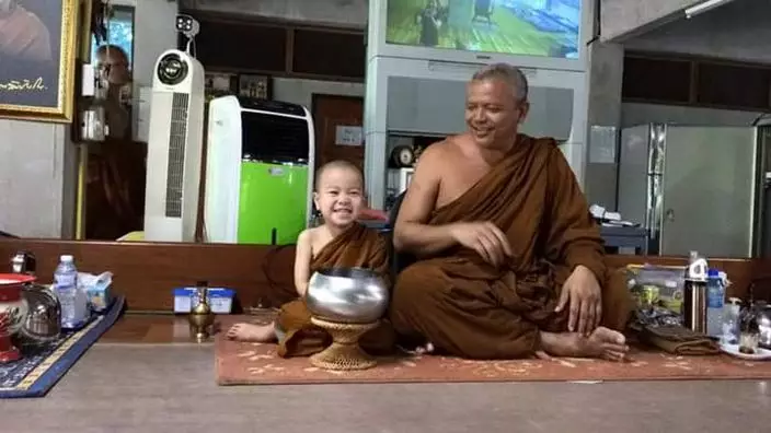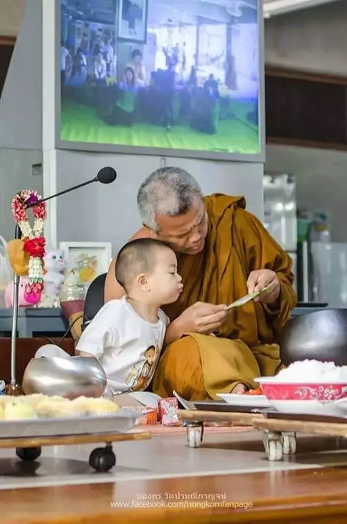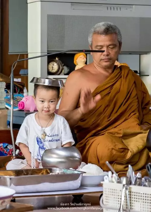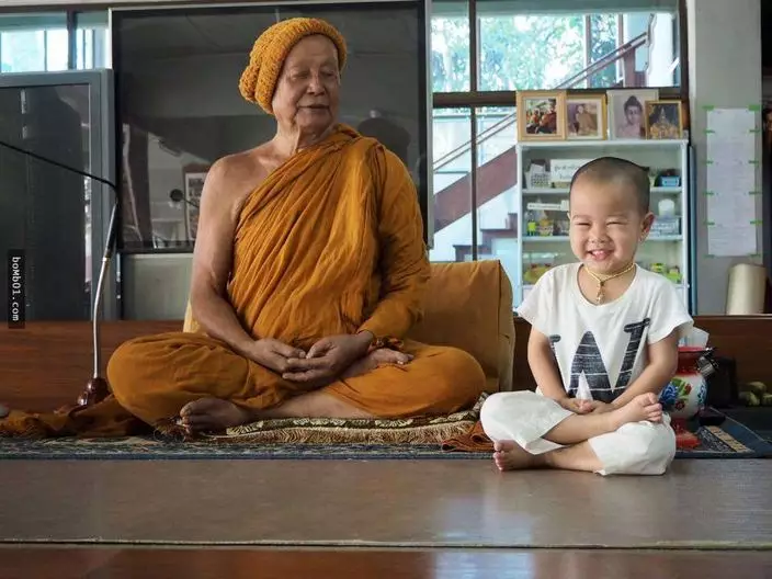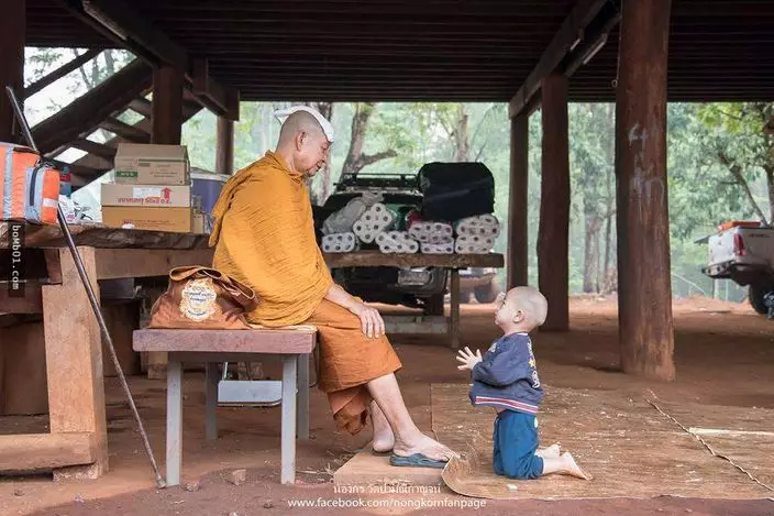 兩歲半的泰國男童Nongkorn在三個月大時就開始接觸佛法,父母每日早上都送他去Wat Pa Maneekan寺廟,跟隨和尚師父學佛。