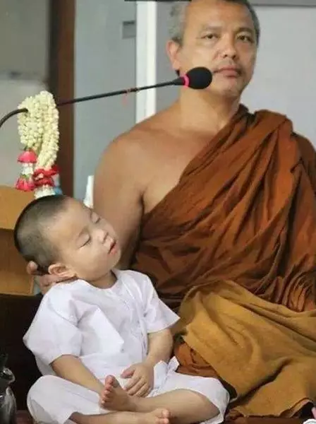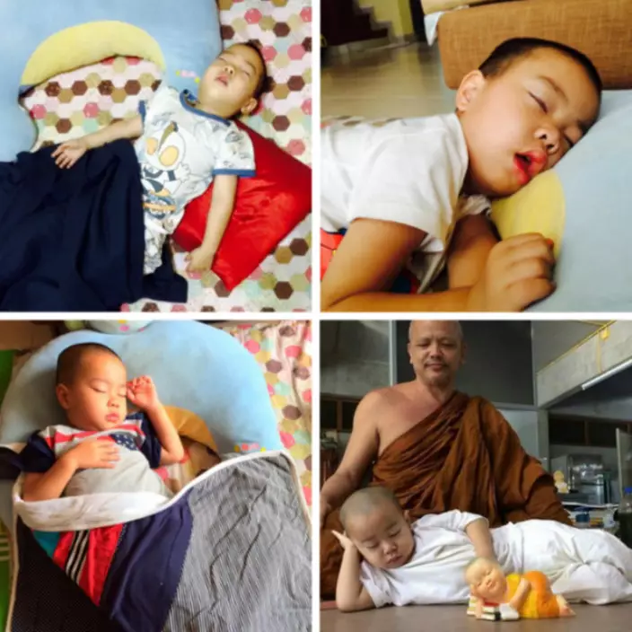 不過Nongkorn年紀尚少常常不敵睡魔,打坐聽佛經時仍會在師傅身旁酣暢甜睡。