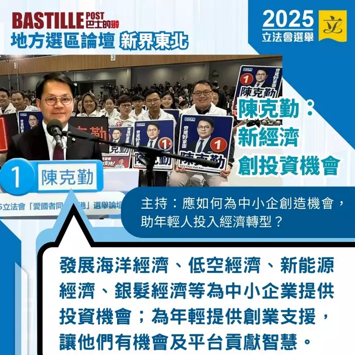 就第二條問題,1號陳克勤表示,海洋經濟、低空經濟、新能源經濟、文化經濟等都能提供很多就業機會和投資機會給中小企,並帶動行業到東南亞、東盟國家發展,助中小企業走出香港;同時,要關注年輕人就業、學業、創業,除政府要給多點創業支援,更重要是令年輕人有信心,有機會及有平台去貢獻自己的智慧,營造一個公平公正和多元的社會。