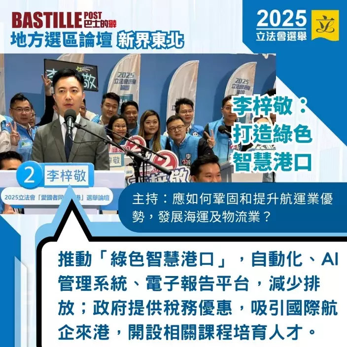 就首條問題,2號李梓敬認為,需要打造一個「綠色智慧港口」,有AI管理、電子報告平台等加速卸貨清關流程和速度;另提供稅務優惠,減少監管,吸引國際航運企業來港,帶動船舶租賃、海事仲裁等,並配合培育本地人才,如開辦國際海事法課程等;加強粵港澳大灣區港口合作。