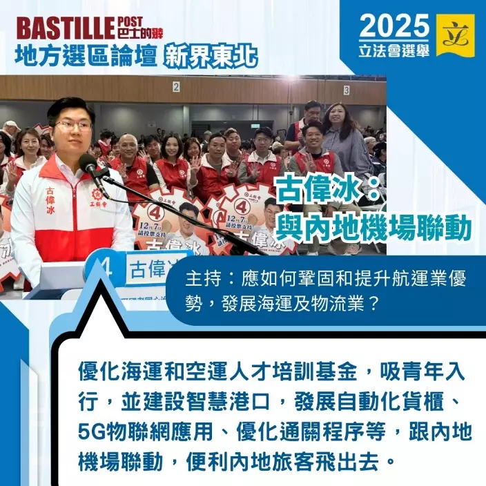 就第二個問題,4號古偉冰認為,首要是人才培養,優化海運和空運人才培訓基金,吸引青年入行;為現有從業員提供再培訓,補充人才缺口;發展智慧港口,包括自動化貨櫃、5G物聯網應用等,優化貨物通關程序;與內地機場聯動,特別是珠海機場,結合優勢,加強京珠港飛直通客運服務,便利內地旅客飛往國際。