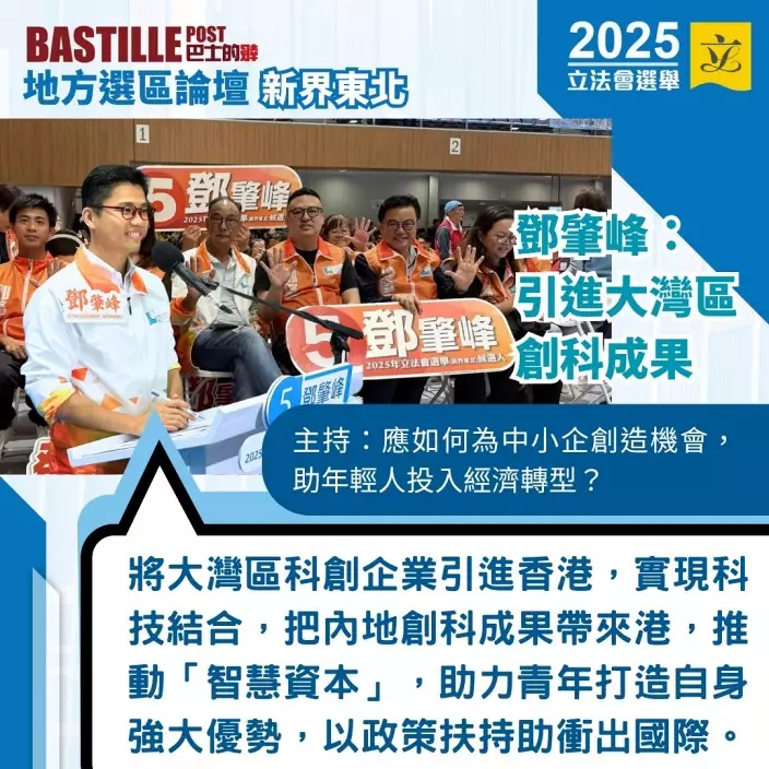 就首條問題,5號鄧肇峰認為,香港作為大灣區一部分,政府應積極進取,將大灣區現有科創企業帶來港;把內地創科成果帶來港,推動「智慧資本」,不只投錢,還要幫青年人「強大」,去海外推廣香港完善項目,政府政策扶持,助青年衝出國際