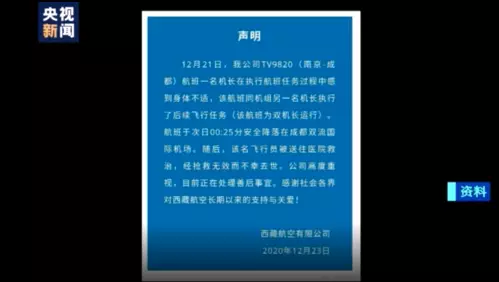 西藏航空公司23日發佈一份聲明,12月21日,該公司TV9820南京—成都航班一名機長,在執行航班任務過程中感到身體不適,該航班同機組的另一名機長執行了後續飛行任務。這架航班於12月22日00:25分,安全降落在成都雙流國際機場。隨後,該機長被送往醫院救治,經搶救無效不幸去世,年僅39歲。目前,西藏航空正處理善後事宜,西藏航空並未透露該機長的具體病因以及更多事件的詳細過程。
