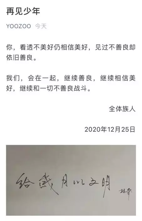 游族網路公眾號發佈一則「再見少年」的消息,署名為“全體族人”。