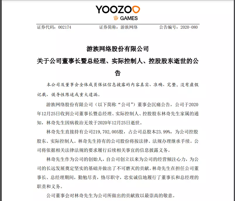 當天,游族網路發佈公告稱,收到公司董事長暨總經理、實際控制人、控股股東林奇家屬的通知,林奇因病救治無效於12月25日逝世。
