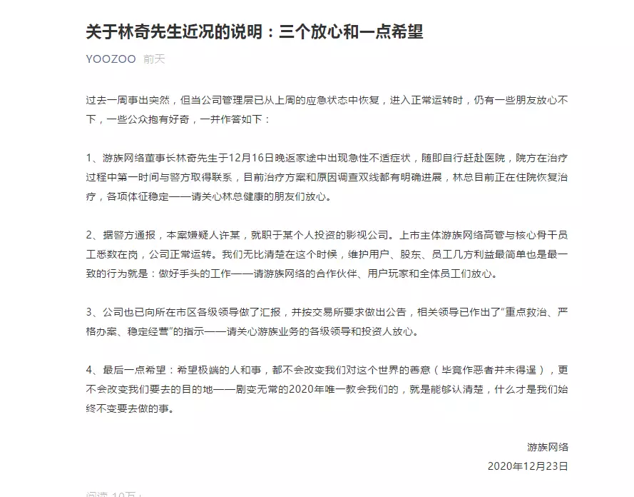 當天,游族網路再度發佈聲明稱,游族網路董事長林奇於12月16日晚返家途中出現急性不適癥狀,隨即自行趕赴醫院,院方在治療過程中第一時間與警方取得聯繫,目前治療方案和原因調查雙線都有明確進展,林奇目前正在住院恢復治療,各項體征穩定。