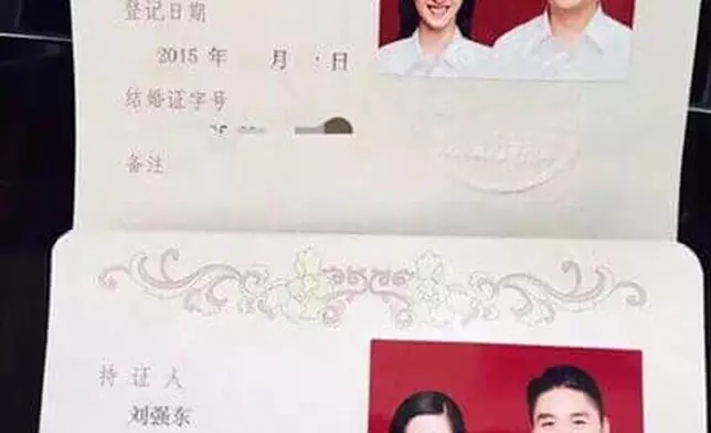 被曝光的相片中可見劉強東和細自己19年的奶茶妹妹在民政局宣誓結婚,夫妻兩人拿著結婚證甜笑合影,劉強東摟著嬌妻的腰,十分甜蜜。