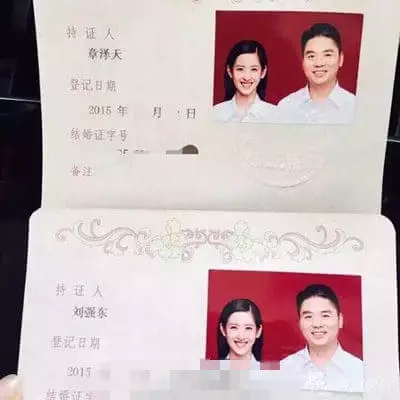 劉強東與章澤天的結婚證上的照片