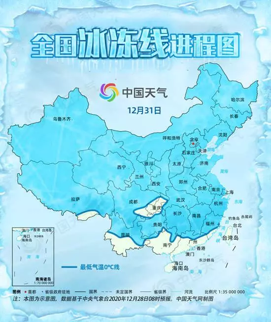 年度「霸王級」寒潮來了!12月28日早晨中央氣象台已將寒潮預警升級為最高級別的橙色預警,全國大部地區都將要「凍哭」。中國天氣網推出冰凍線進程圖,一圖看冰凍線何時跨長江、抵達雲南、廣西、廣東,預計到31日超八成國土或將被「冰凍」!