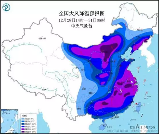 今冬以來最強寒潮已經啟程,中央氣象台時隔4年再發寒潮橙色預警,28日至31日,中東部大部地區氣溫將下降10℃左右,局地降溫幅度可達16℃以上。本次寒潮降溫速度快,一些區域更是「斷崖式」降溫,這將比2016年1月的寒潮變溫更加劇烈,從這個角度來說,今年的跨年寒潮將堪比「霸王級」寒潮。