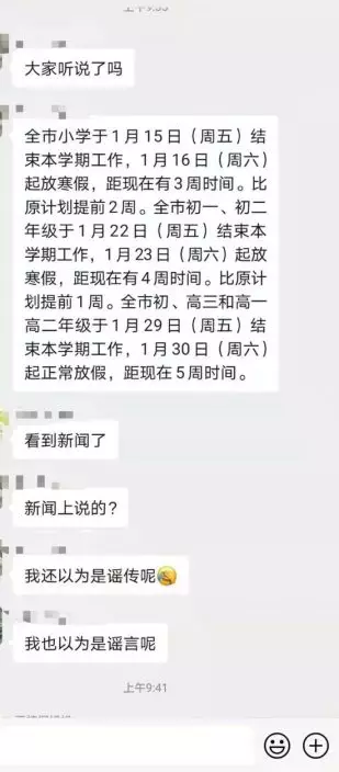 今日網上流傳的《通知》稱,全市小學於1月15日(周五)結束本學期工作,1月16日(周六)起放寒假,距現在有3周時間,比原計劃提前2周。全市初一、初二年級於1月22日(周五)結束本學期工作,1月23日(周六)起放寒假,距現在有4周時間。比原計劃提前1周。全市初、高三和高一高二年級於1月29日(周五)結束本學期工作,1月30日(周六)起正常放假,距現在5周時間。