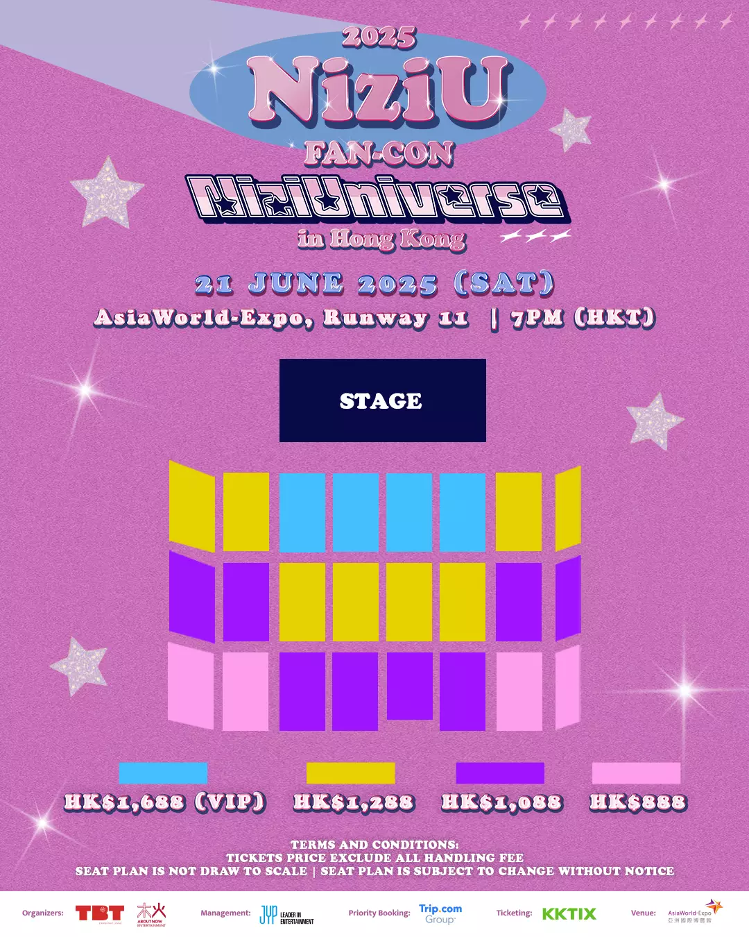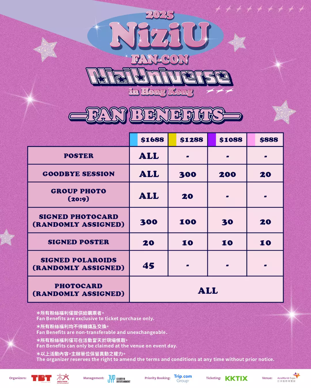 歌迷見面會定於2025年6月21日假亞洲國際博覽館11號展館舉行首次香港歌迷聚會,NiziU早前優先訂購反應熱烈,門票火速爆滿,足見NiziU在香港的超高人氣。公開發售將於2025年5月16日中午12時正式展開,「WithU」們(NiziU粉絲的暱稱)務必把握機會,搶購心儀門票。