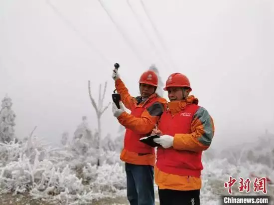 檢修公司員工巡視110千伏岳龍楊線,並監測線路覆冰情況,確保線路設備安全穩定運行。 李銘明 攝