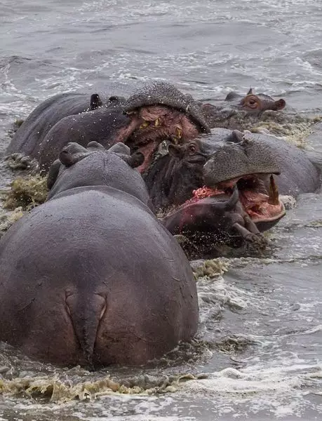 非洲南部國家津巴布韋的一個國家公園發生同類相殘的慘劇,一隻僅有2日大的小河馬被一群成年河馬撕咬致死,最後更被一條鱷魚吞食。