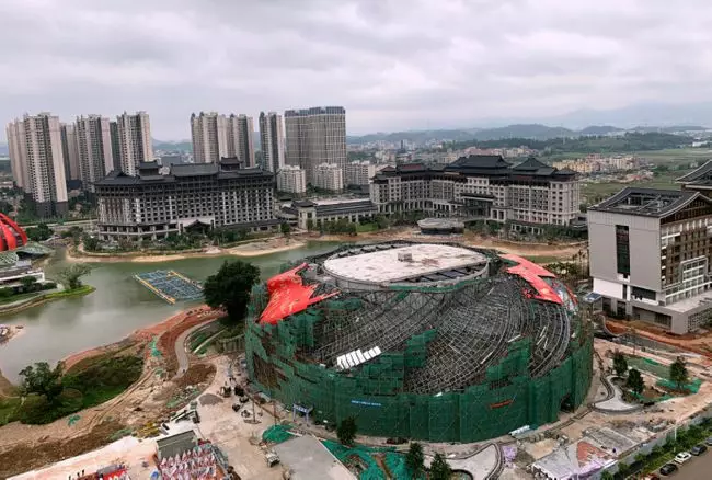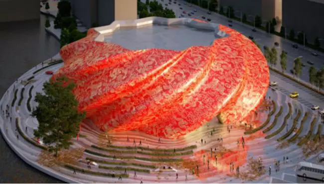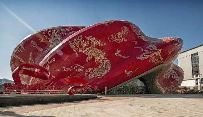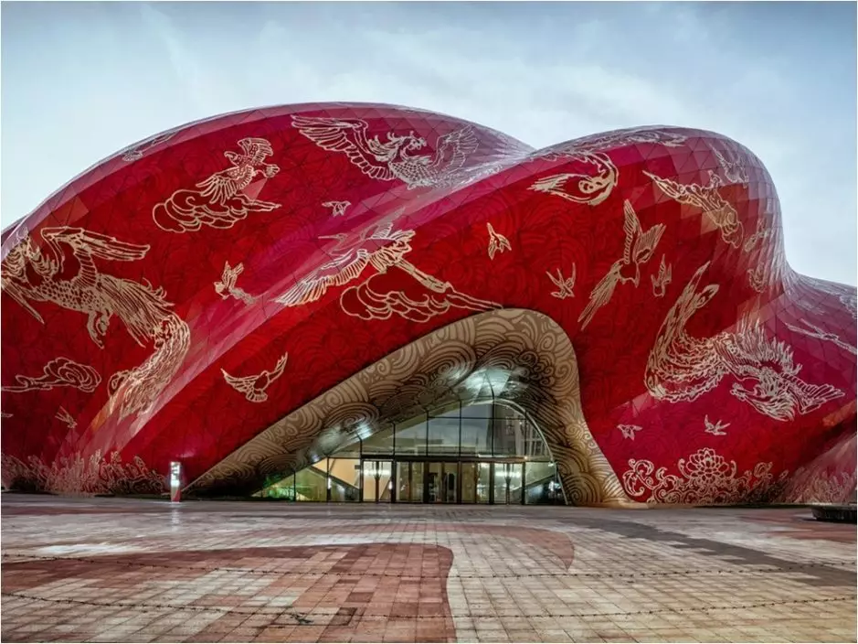 成為今年「中國十大醜陋建築」第一名的是剛建成投入使用的廣州融創大劇院。該劇院由英國建築事務所Steven Chilton Architects設計,據稱其創意理念靈感源於海上絲綢之路,外觀可以引發人們對於絲綢褶皺和紋理的遐想。整個劇院的外層將以「中國紅」為基調,「像徵火焰般的中國文化,同時寓意著好運,喜慶和歡樂」。
